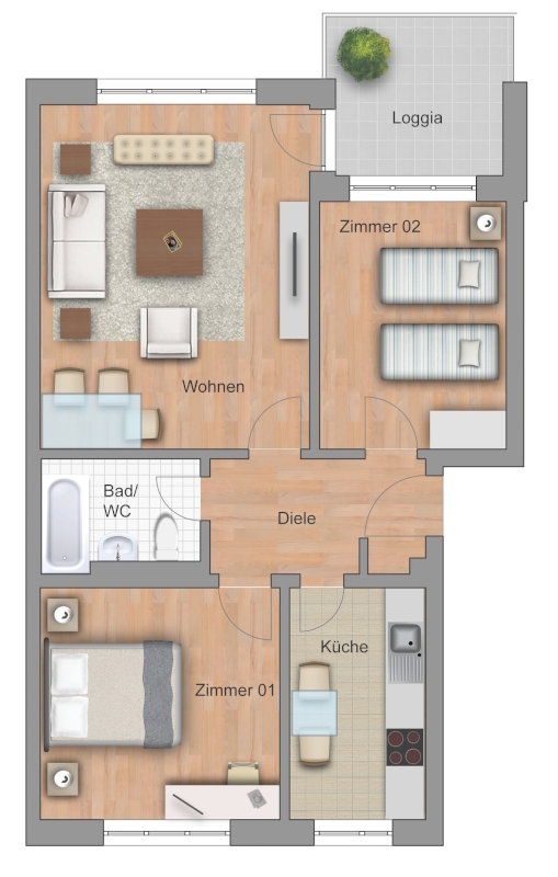 Die hier zu Vermietung stehende Wohnung bietet Ihnen drei praktisch geschnittene Zimmer, mit ausreichend Platz für die kleine Familie. Am Wohnzimmer befindet sich der Zugang zur großen Loggia, auf welcher Sie sich Ihre eigene kleine Wohlfühloase schaffen können. Im Flur und den Zimmern ist moderner Laminatfußboden verlegt, die Küche und das Bad mit Wanne sind gefliest. Hell und freundlich wird die Wohnung durch ihre großen Fenster, welche sich in jedem Wohnraum wiederfinden. Ein praktischer Einbauschrank im Flur, ein Kellerabteil sowie ein Stellplatz auf dem objekteigenen Parkplatz (optional zum anmieten für mtl. 20,- €) runden dieses attraktive Wohnungsangebot ab.