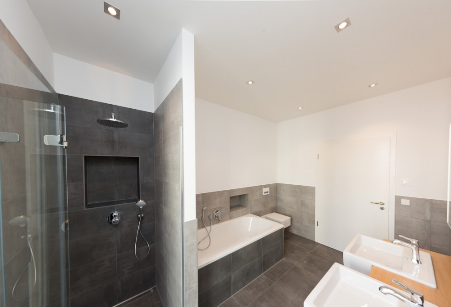- modern gefliestes Masterbad mit Wanne, ebener Dusche, Doppelwaschtisch
